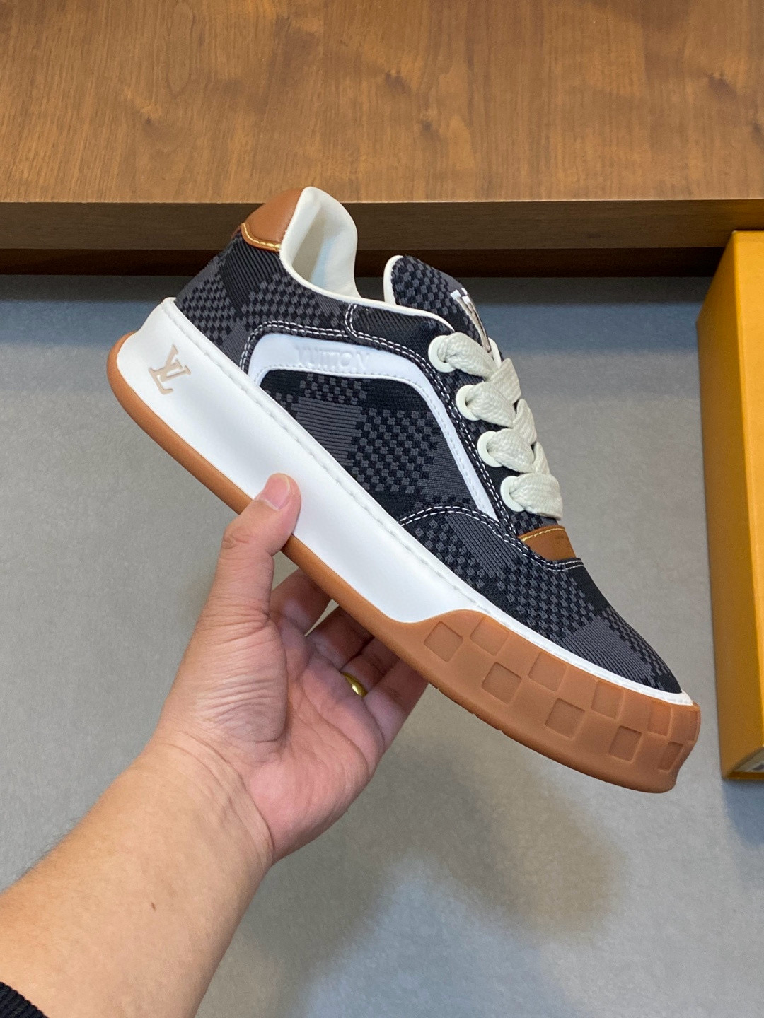 루이비통 틸티드 스니커즈는 스케이트 슈즈에서 영감을 받아 탄생한 로우탑 스니커즈로, 시그니처인 기울어진(Tilted) LV 로고가 텅에 자수되어 있습니다.